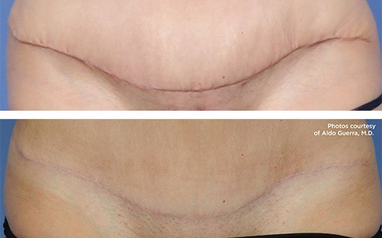 Tummy tuck scar shown before & after using Embrace scar therapy. Photos courtesy Neodyne Biosciences, inc.