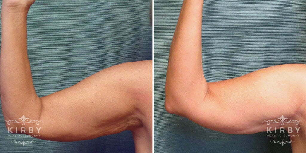 This 57 year-old female patient lost 40 lbs. through diet and exercise but was bothered by redundant skin of the upper arms. Dr. Kirby performed a mini-brachioplasty with power-assisted liposuction.