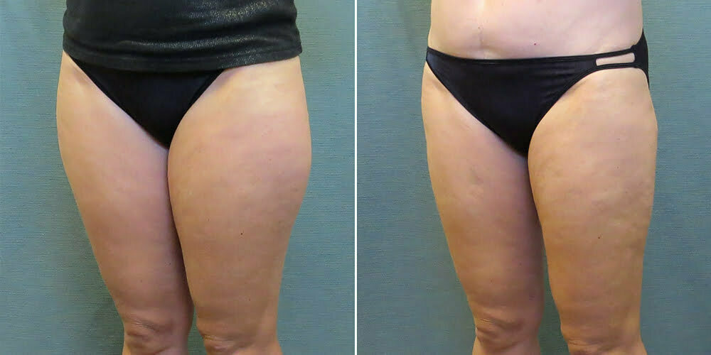 This 49 year-old patient was bothered by the shape and size of her thighs. Because she had some excess fat accumulated on her inner and outer thighs, but good skin elasticity, Dr. Kirby recommended liposuction to address the excess fat and reshape the thighs. Through tiny, pea-sized incisions, Dr. Kirby performed liposuction on the medial and lateral thigh area, removing excess fat and sculpting a slimmer contour to the inner and outer thighs. The patient is now much happier with the appearance of her thighs.