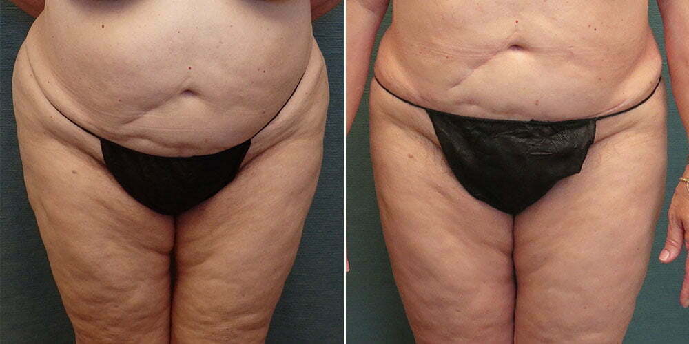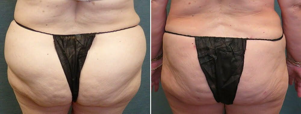A 68 year-old female complained of having difficulty finding pant sizes that fit well. She had previously undergone a TRAM abdominal flap surgery. This time she wished to have power-assisted liposuction of her flanks and outer thighs.