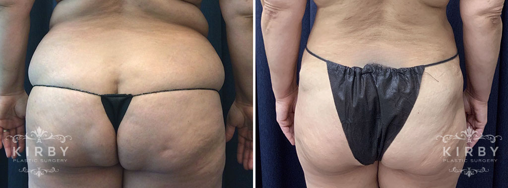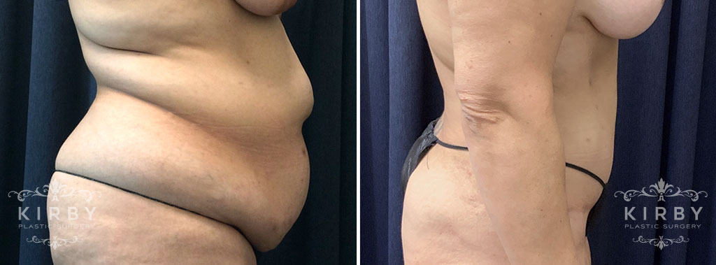 A 46-year-old HF mother of 2 breastfed children lost 40lbs by diet and exercise. She underwent extended abdominoplasty with rectus muscle plication, power-assisted liposuction of the flanks, axillary breast tissue, and her back. She also underwent mastopexy. After surgery, she desired to continue losing weight and started semaglutide to lose additional weight for a total of 50 lbs lost overall. She returned for additional liposuction of the upper arms, flanks, and lateral chest. Photos shown are 18 months after initial body contouring.