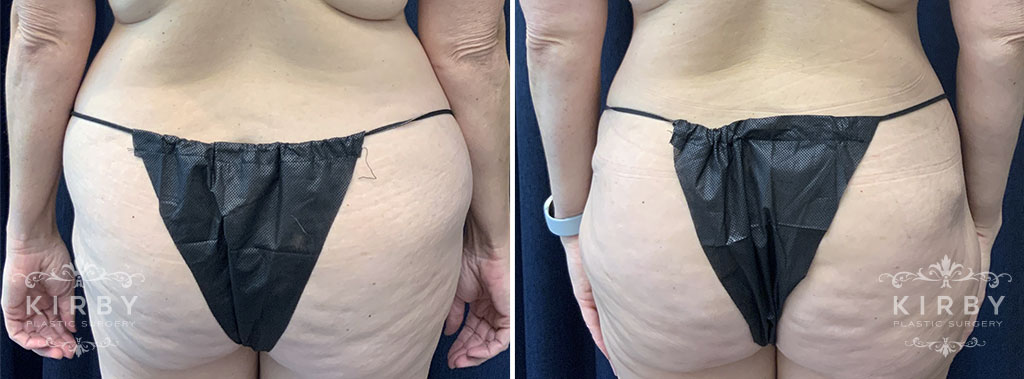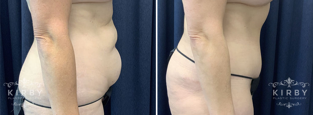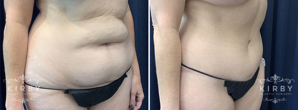 A 47-year-old mother of 2 breastfed children was bothered by “flappy” breasts after initial breast augmentation with saline implants 22 years ago, followed by removal of the implants due to rupture. She was also bothered by a “roll” of tissue along her lower abdominal wall. She underwent extended abdominoplasty with rectus muscle plication, power-assisted liposuction of the flanks, and bilateral breast augmentation using smooth silicone soft touch “gummier” 325cc implants placed under the muscle with mastopexy. Her off-center belly button remains a bit off-center and her natural breast asymmetry is improved.